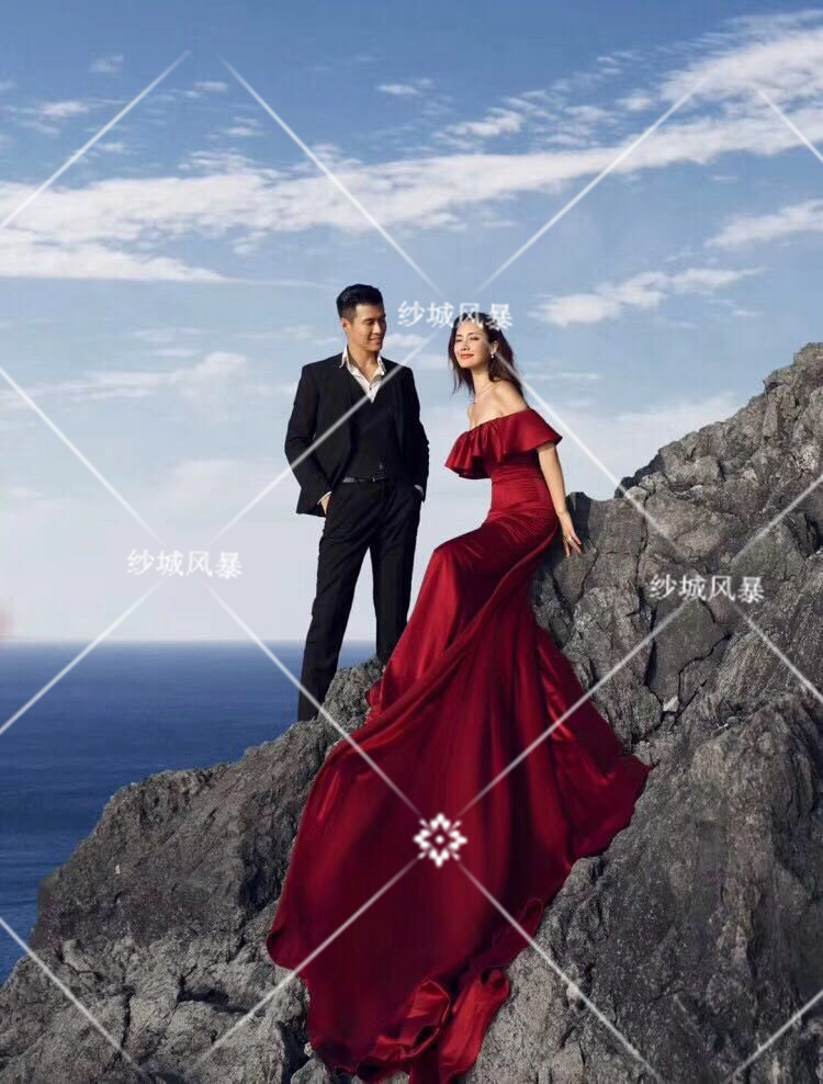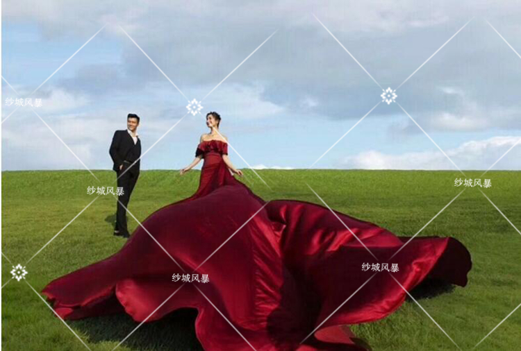 Photo studio theme clothing location seaside travel photography wedding photography couple photo one-shoulder red long tail dress
