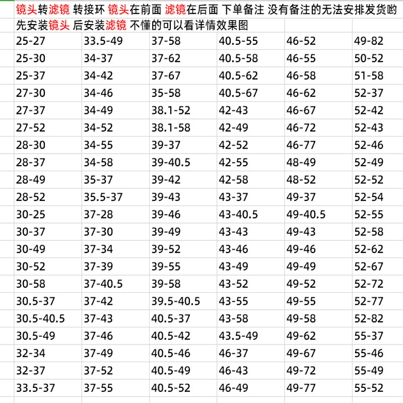 Lens filter adapter ring Small turn Big turn small turn 49-52-55-58-62-67-72-77-82