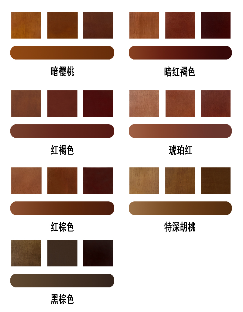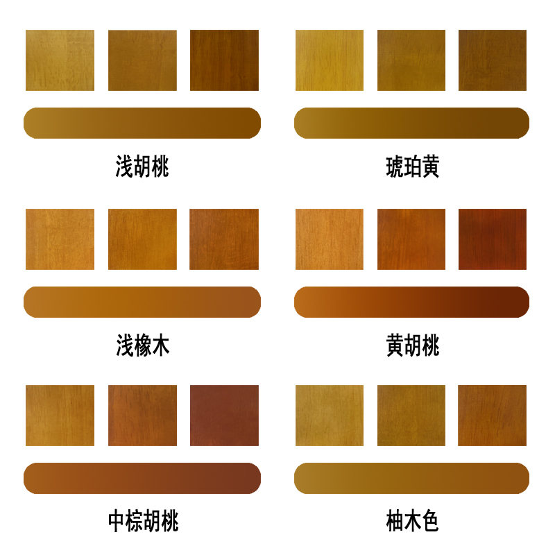 Shallow red palm (translucent) Amber Yellow (Translucent) Walnuts (Translucent) Red Wood (Translucent) Light Walnuts (Translucent) Red Brown (Translucent) Light Oak Wood (Translucent) Shallow Oak (Translucent)