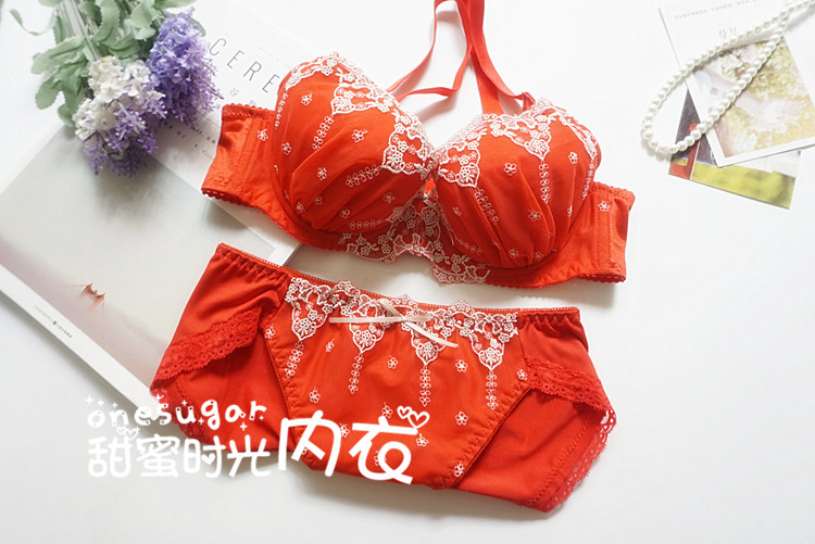 Broken code special 70B Japanese girl large size embroidery thin cup big red natal year wedding red underwear suit