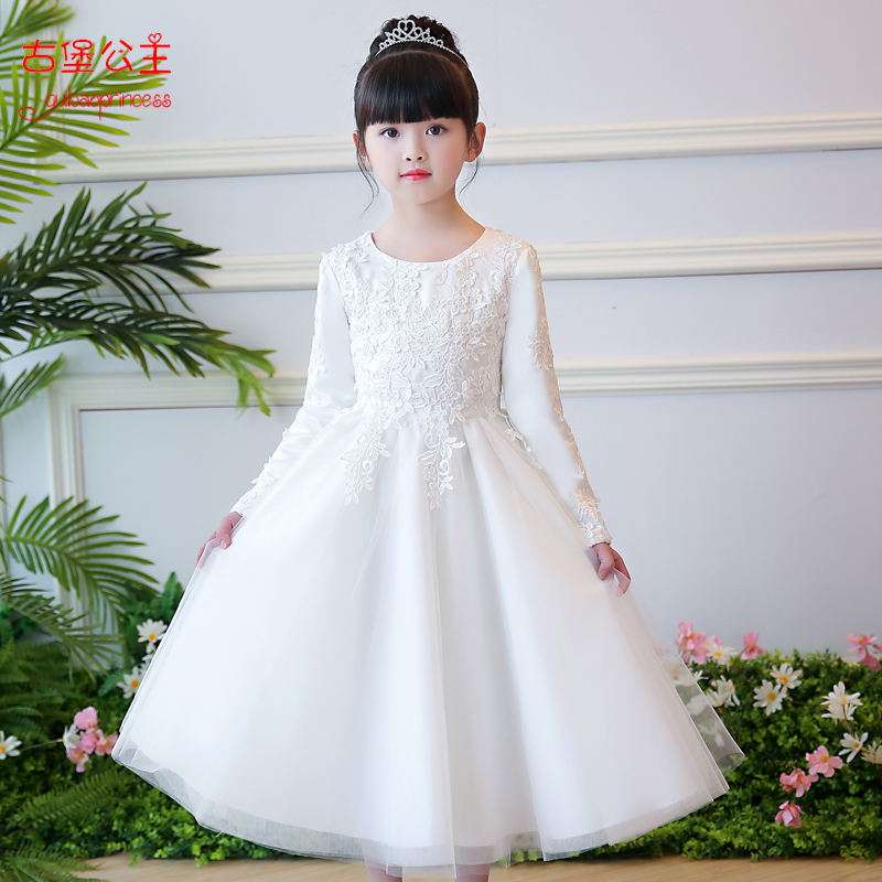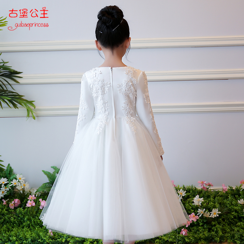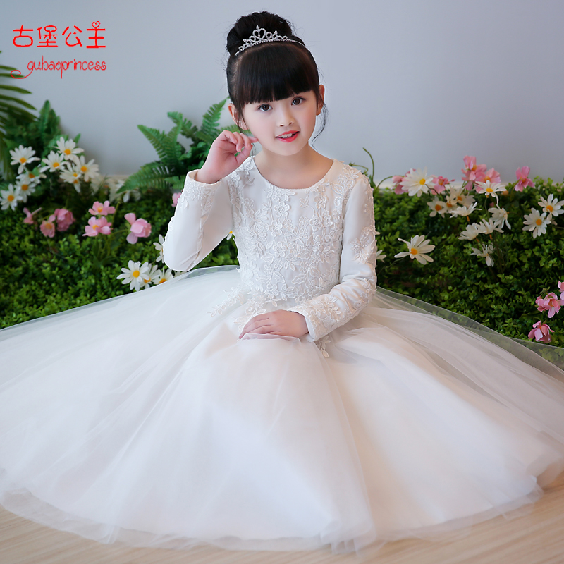 Girl Gown Dress Winter Children Wedding Dress Fluffy Dress Princess Flowers Children Birthday Piano Show With Long Sleeves Gush White