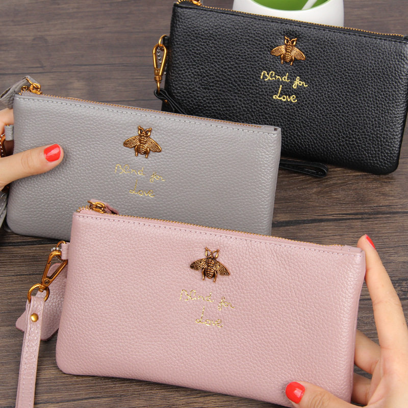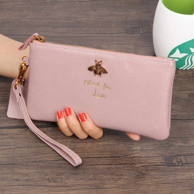 First layer cowhide long version zipper wallet women's new European and American little bee clutch women's cowhide mobile phone coin purse trend