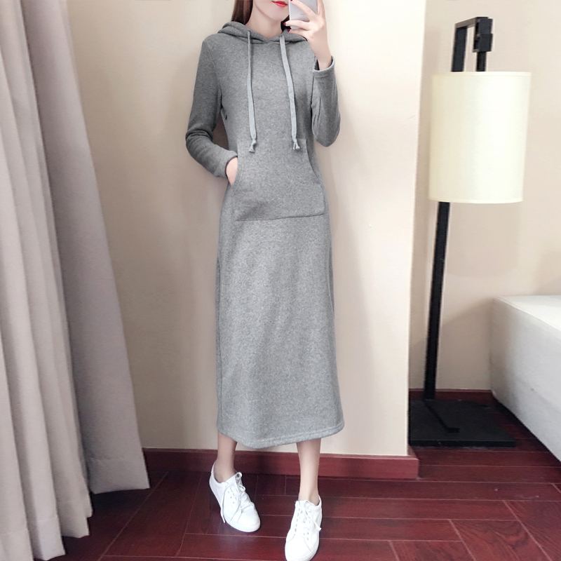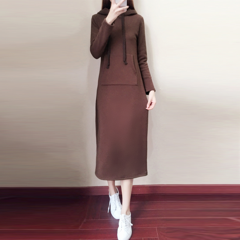 Autumn and winter long version over kneecap female 2022 new Korean version wave loose long sleeve plus suede thickened with cap foreign dress