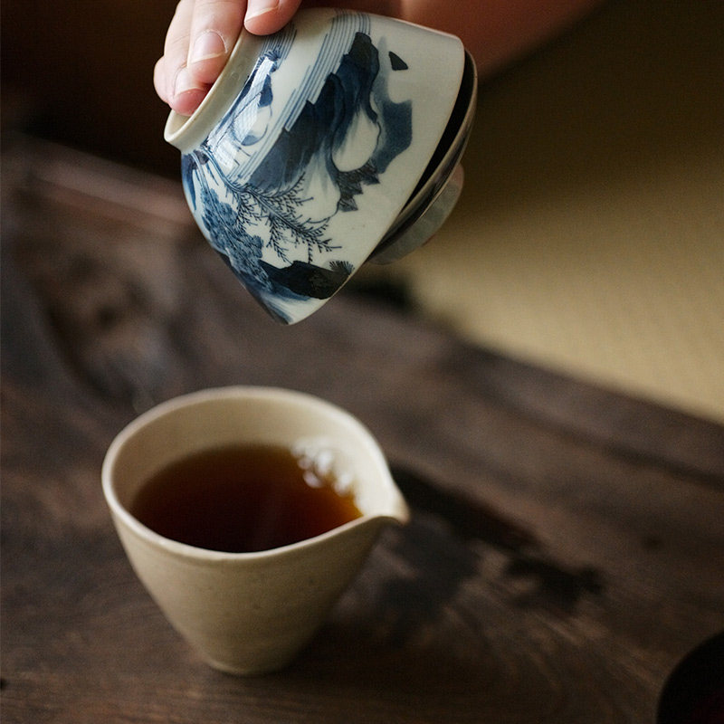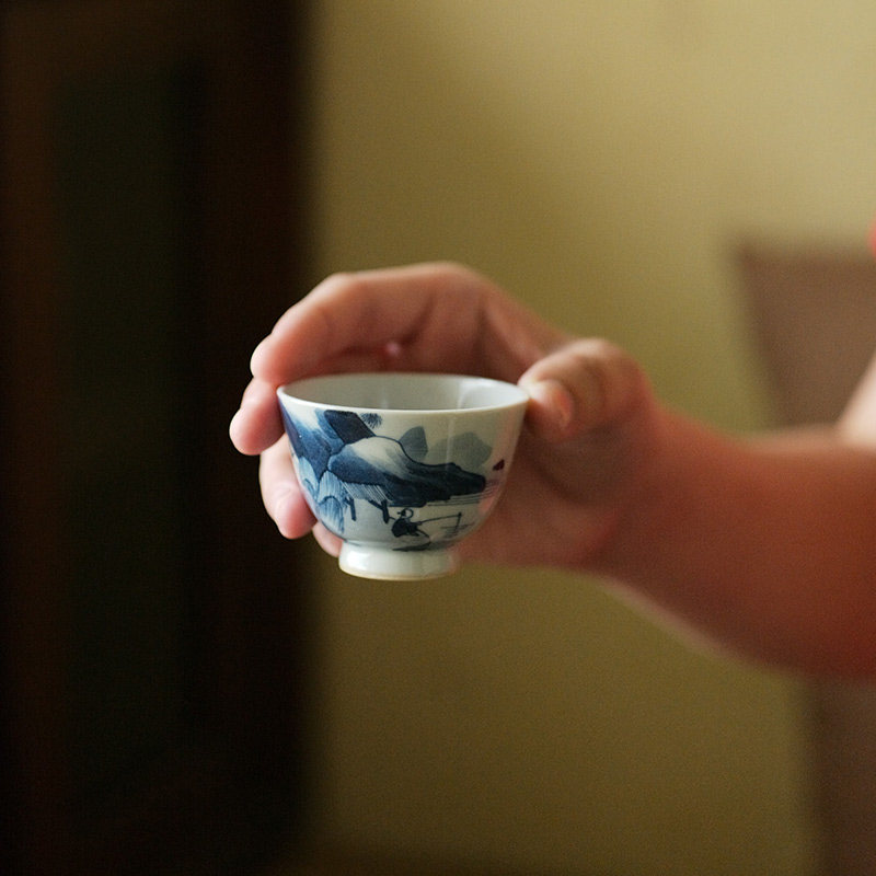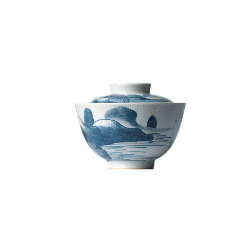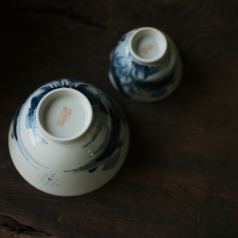 Taichu Lotus Hall Jingdezhen antique blue and white glaze Kangxi landscape set cover bowl cup Miyun Zhai