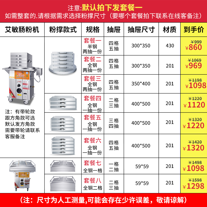 Set 1 4-layer 5-pump (30*35) Half Steel (2 draws 1 piece) Package 2 4-layer 5 draws (30*35) All steel (2 draws 1) Package 3 4-layer 5 draws (35*40)All steel increase (2 draws 1) Package 4 (2 layers 3 draws (40*50) All steel (1 draw 1 piece) Package 5 3 layers 4 draws (40 *50) All steel (1 draw 1) Package 7 1 layer 2 draws (59*59) All steel (1 draw 1) Set 8 2 layers 3 draws (59 *59) full steel (one draw a copy) package nine 2 layers 3 draws (50 * 50) full steel (one draw a copy) package ten 3 layers 4 draws (50 * 50) full steel (one draw a copy) need to contact customer service to send a connection to make up the difference of 100 yuan ~ ~ The following is the new model (automatic closing powder support) ~ ~ do not run gas ~ steam is more sufficient ~ more convenient to operate ~ ~ recommended ~ with door model (more air-saving) package one (40 * 50) two layers 3 pumps recommended ~ with door model (more air-saving) package two (40 * 50) three layers 4 pump recommended ~ With door model (more air-saving) Package 3 (40 * 50) 4-layer 5 draws Recommended ~ With door model (more air-saving) Package 4 (50 * 50) 2-story 3 draw Recommended ~ With door (more gas-saving) Package 5 (50 * 50) 3-layer 4 draws Need to add a table top board (please contact customer service)