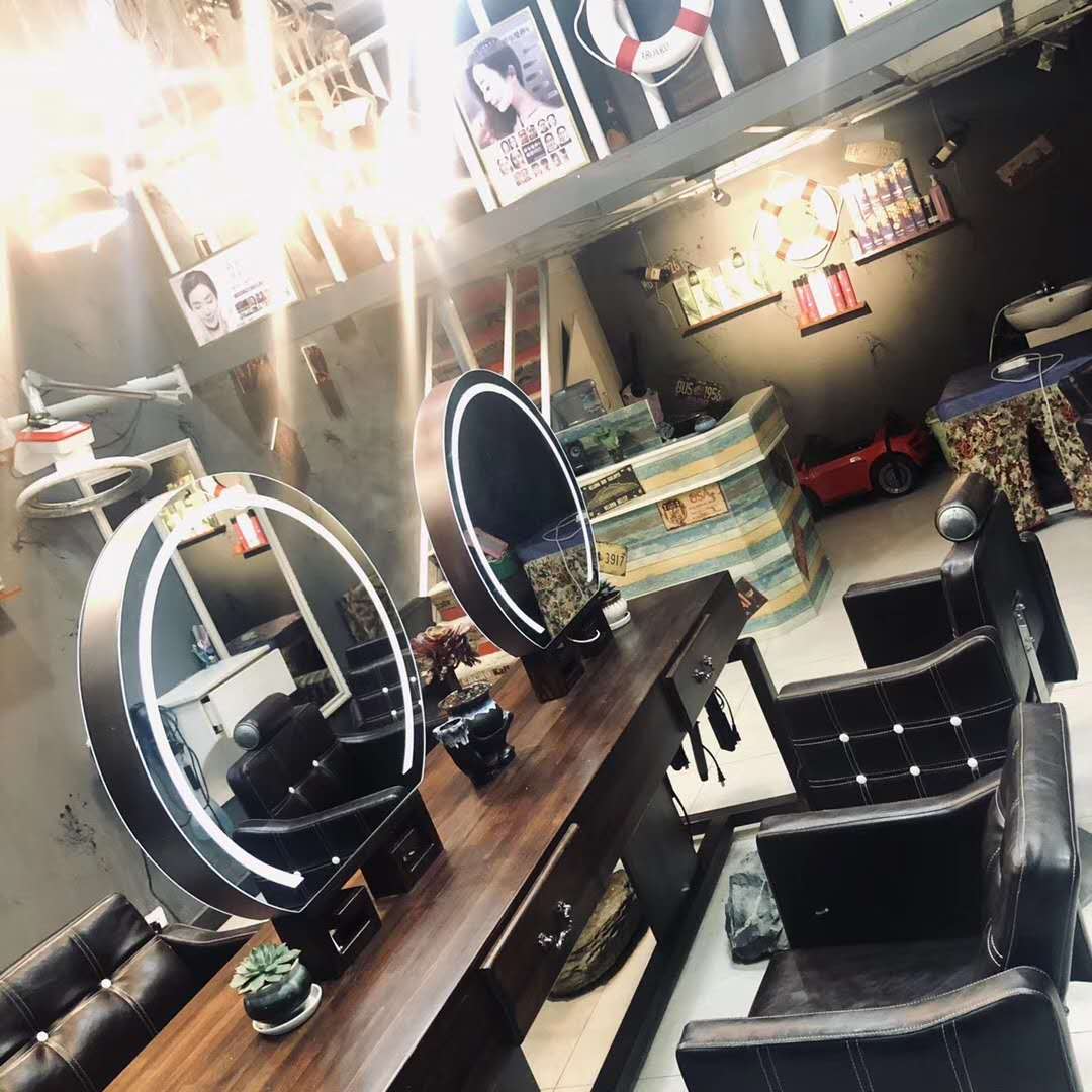 Retro solid wood with lamp round mirror table Beauty hair salon hair salon special barbershop set to make double-sided mirror four-sided mirror table
