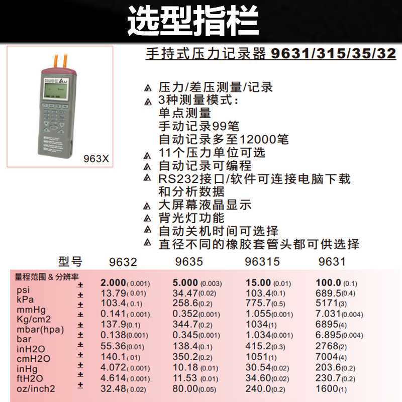 AZ9632 Range ±2psi 13 79kPa AZ9632 Range ±2psi 13 79kPa Charger Kit AZ9635