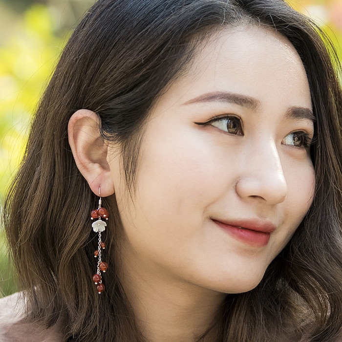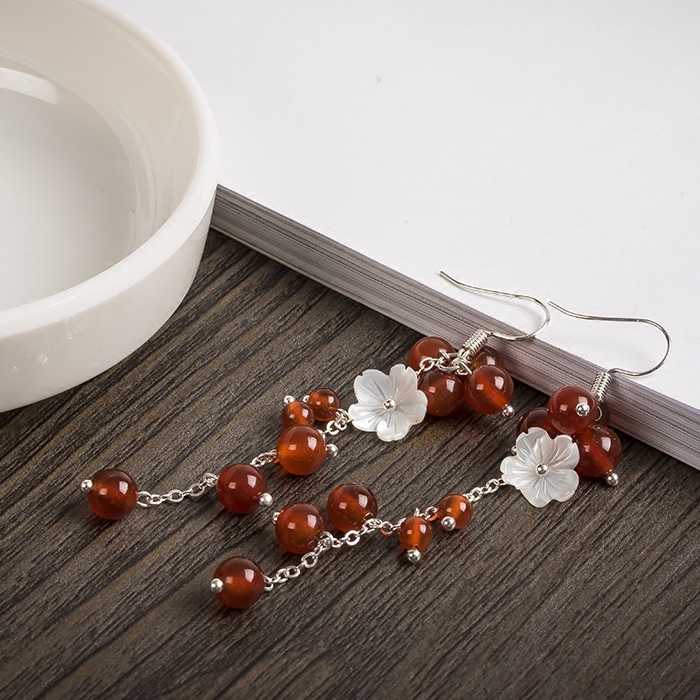 Original woman extra-long style Face Thin Earrings National Wind Red Manau Classical Temperament Shell Floral Earbuds Personality Ornament