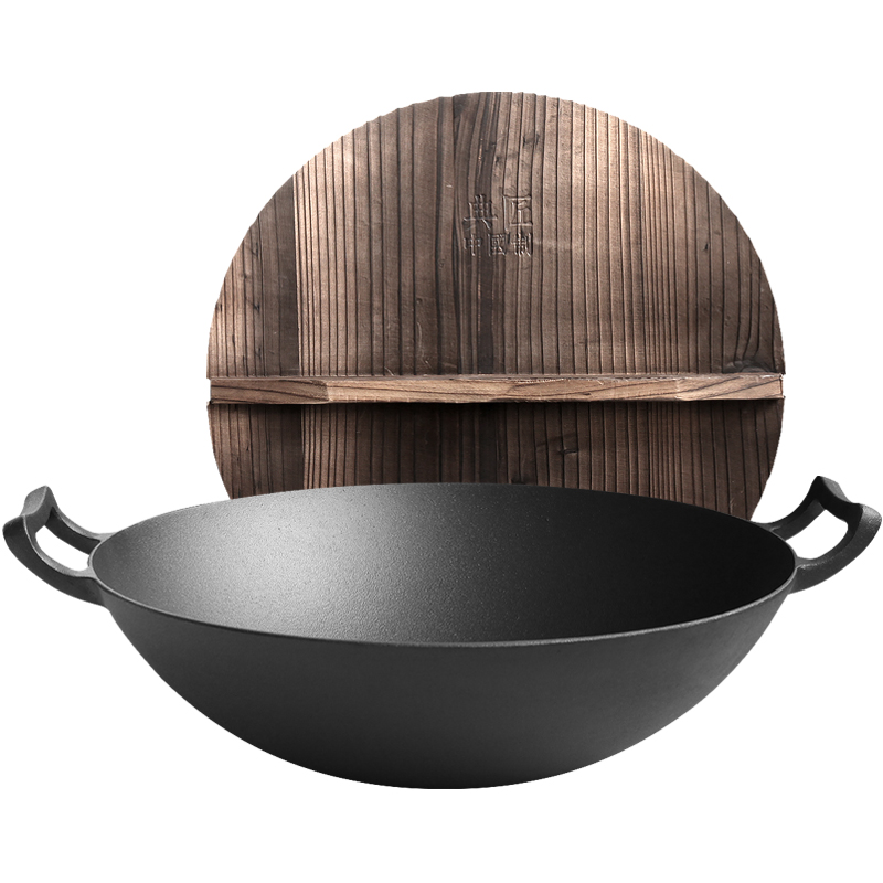 40 double ear iron handle round bottom frying pan (cedar wood cover) 36 double ear iron cake round bottom frying pan (cedar wood cover)