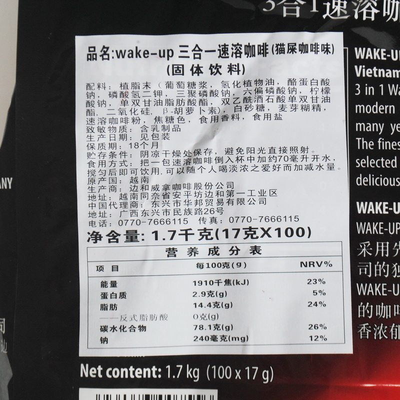 Vietnam Imported Wena Coffee Wake Up Cat Poop Coffee Three-in-one Instant Coffee 1700g Kbagged