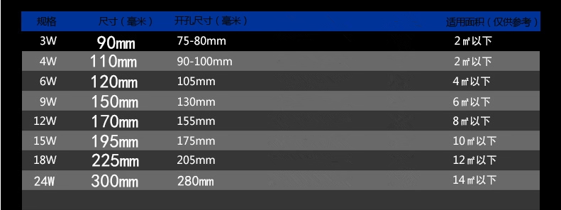 Round 3 watts 2 5 inch white light (opening 7-8cm) round 3 watts 2 5 inch warm (opening 7-8cm) round 4 watts 3 inches white light (opening 9-9 5cm) round 4 watts 3 inches warm