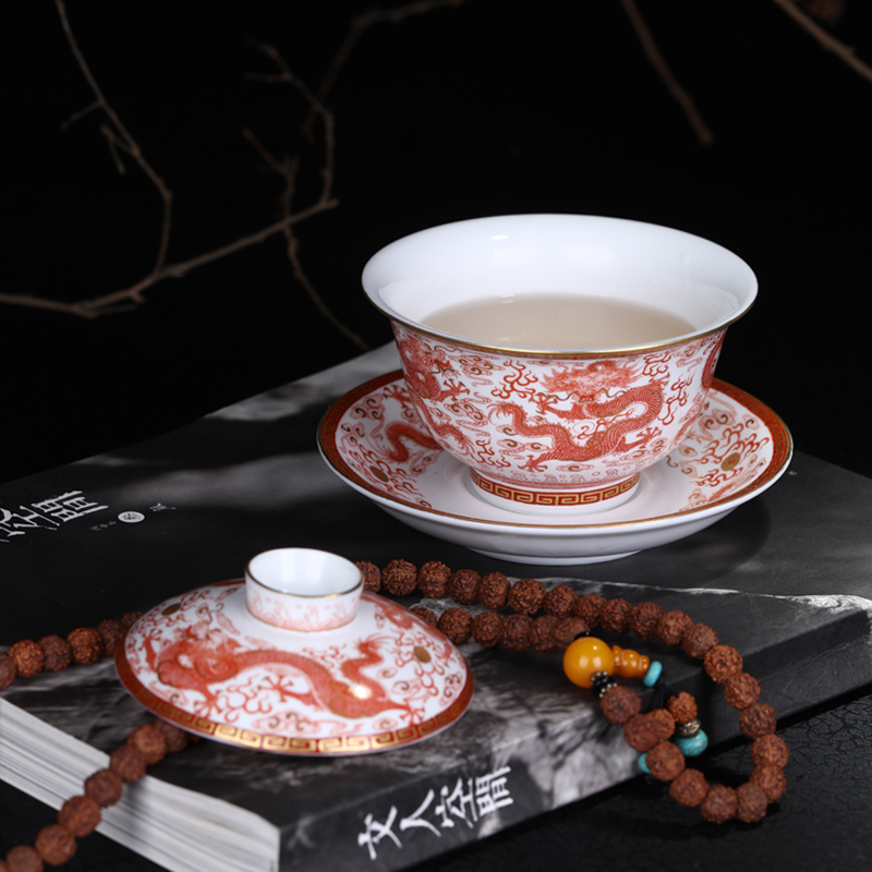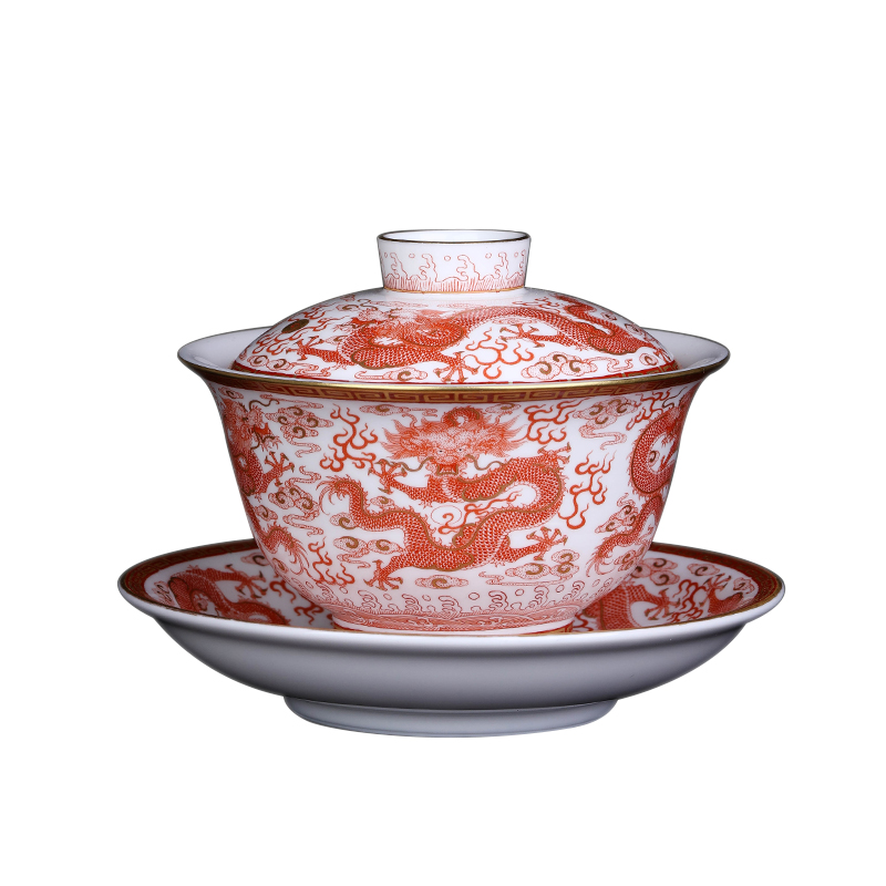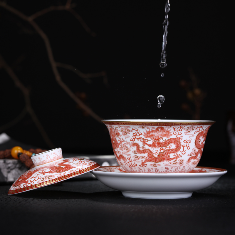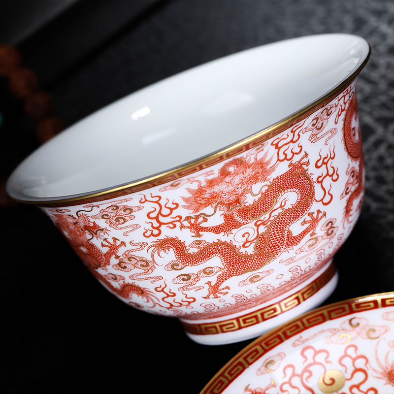 Jingdezhen collection handmade ceramic gold alum red Jiulong Sanchai bowl tea cup kung fu tea set Tea Bowl