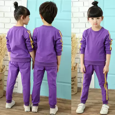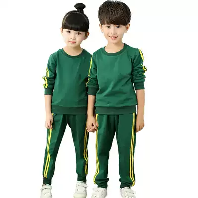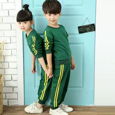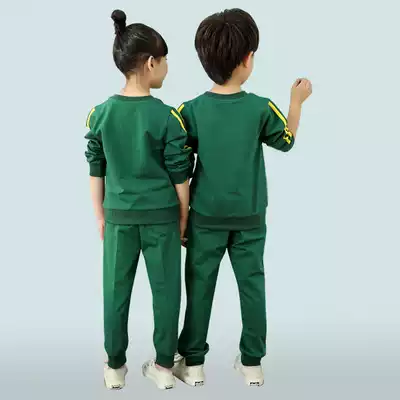 Spring and Autumn Kindergarten Garden Clothing Dark Green Round Neck School Uniform Men and Women Class Clothes Teachers and Students with Double Yellow Bar Sports Pants