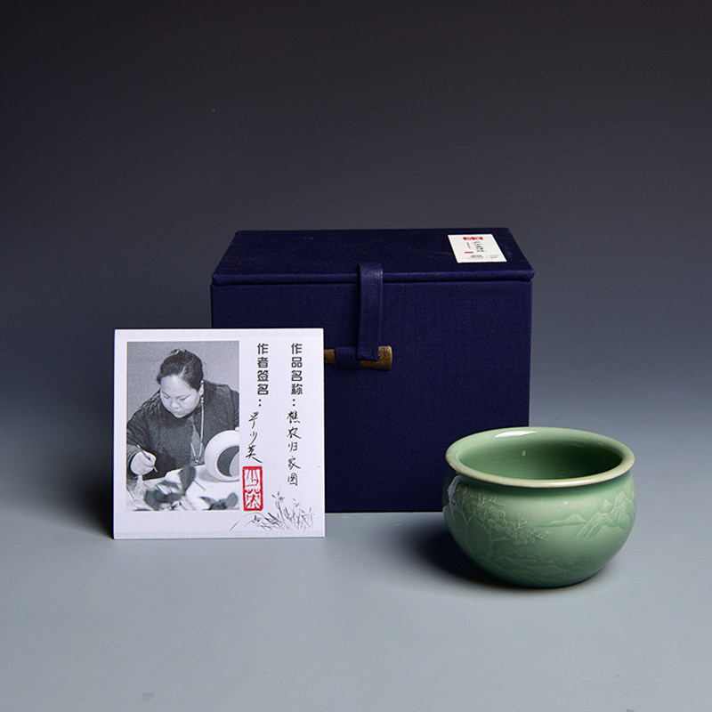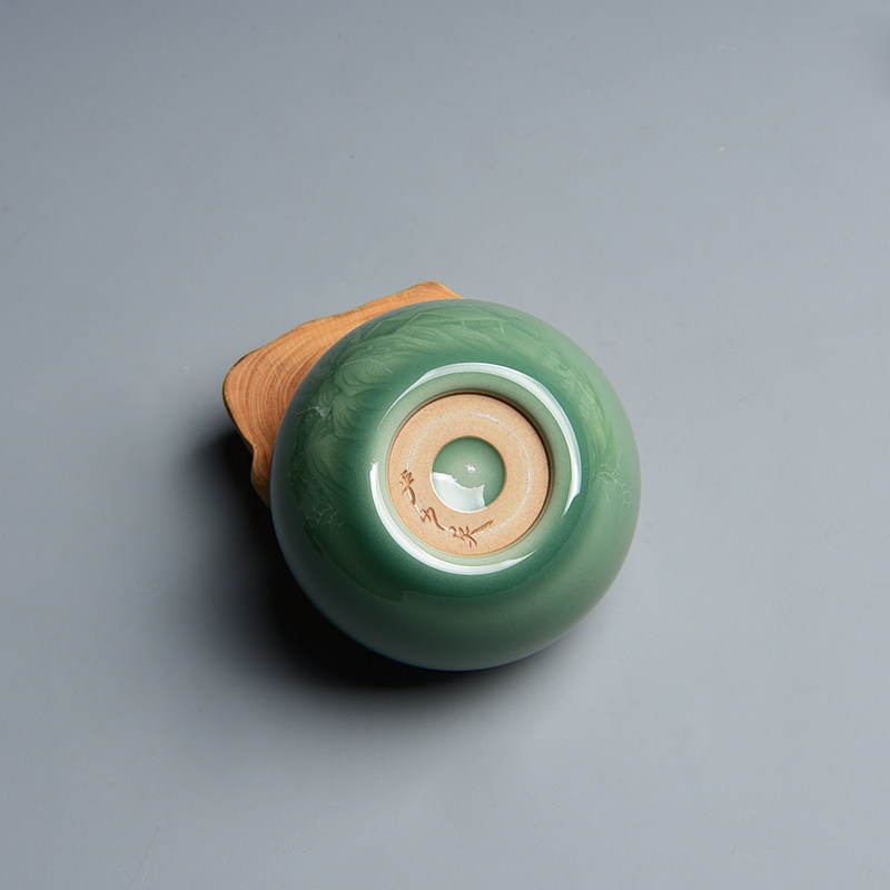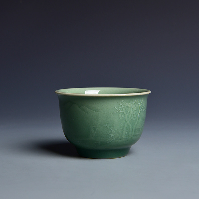 Yan Shaoying Longquan Qingqing Porcelain Cup Plum Green Glazed Hand-carved Mountain Water Cup Master's Cup Teacup Porcelain Cup
