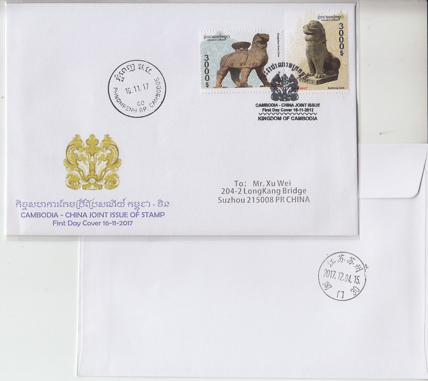 Cambodia's 2017 and China joint issue of Bacon Hill Lions 2 full first day of solid posting with a landing stamp-Taobao
