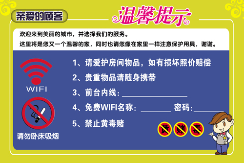 Back room Reminder Guests Tips Hotel Check In before staying in front of the note-sweet tips Please keep your belongings with your belongings Please keep the floor clean Wireless WIFI Please let the lights rest clean when you leave