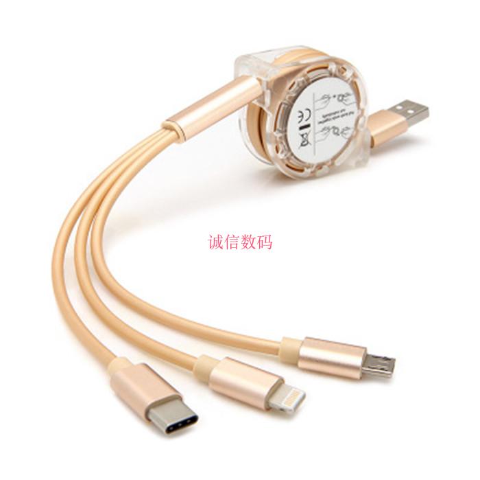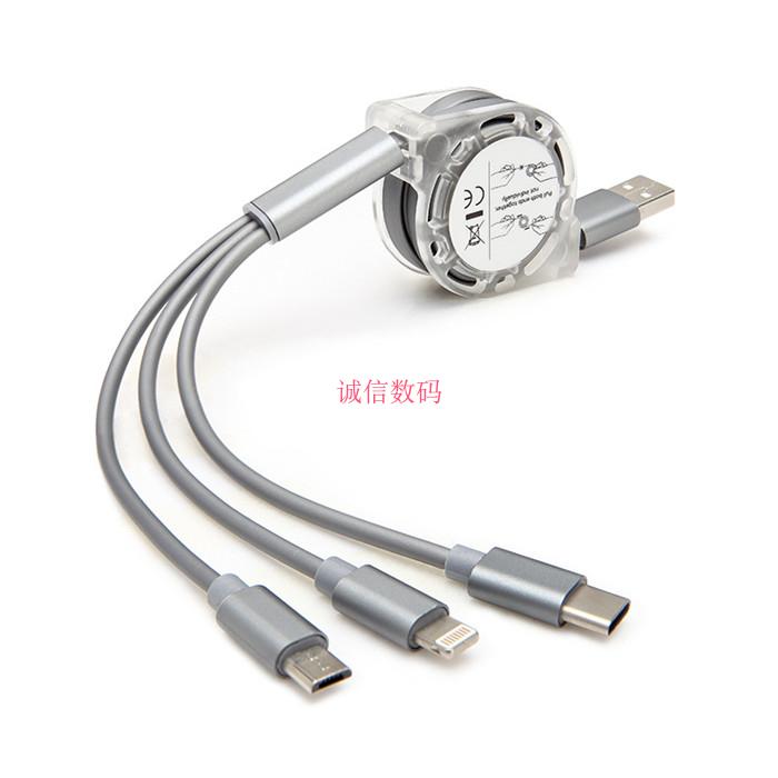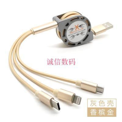 Pearlescent one-to-three multi-function data cable suitable for Apple Android Type-c telescopic mobile phone car charging cable