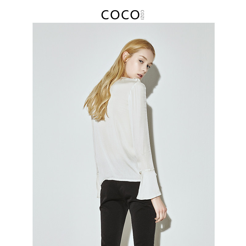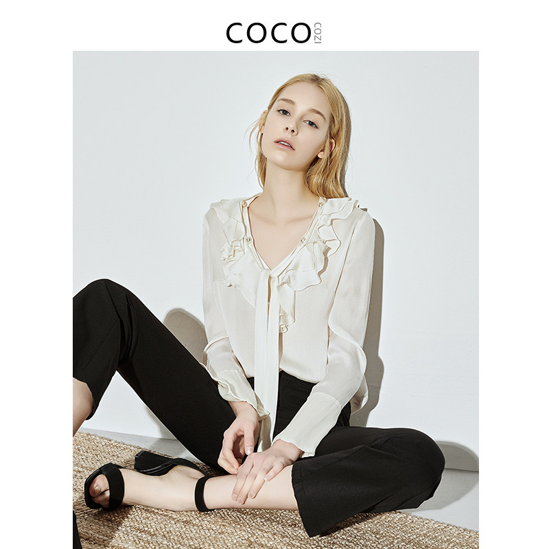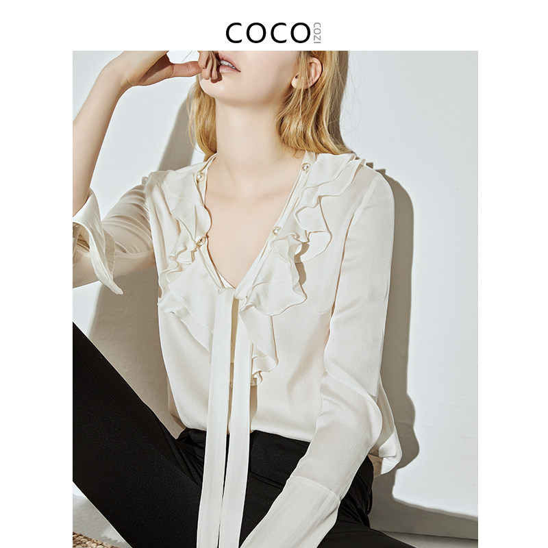 COCOCOZI cilio (true silk) horn cuff real silk shirt V collar lotus leaf side heavy-pound samsilk shirt woman