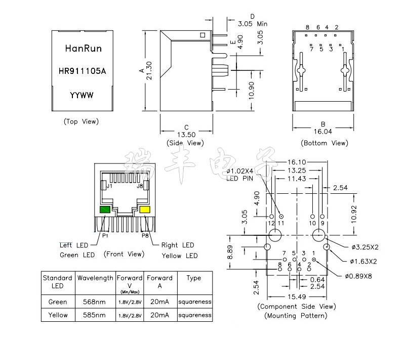 HR911105A Hanren RJ45 Internet interface with lamp HanRun socket Internet isolation transformer with filtering brand new