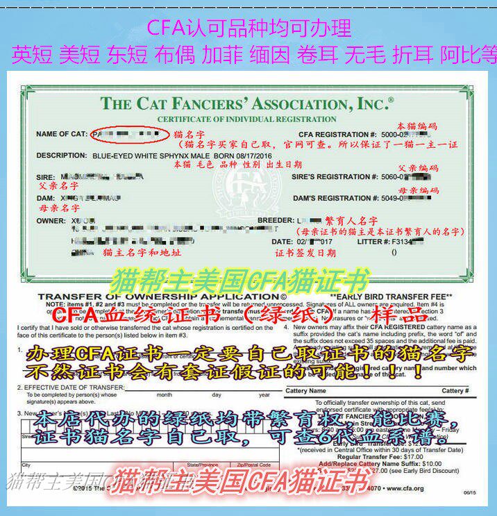 Registration CFA cat certificate CFA green paper pedigree certificate Fidelity registration
