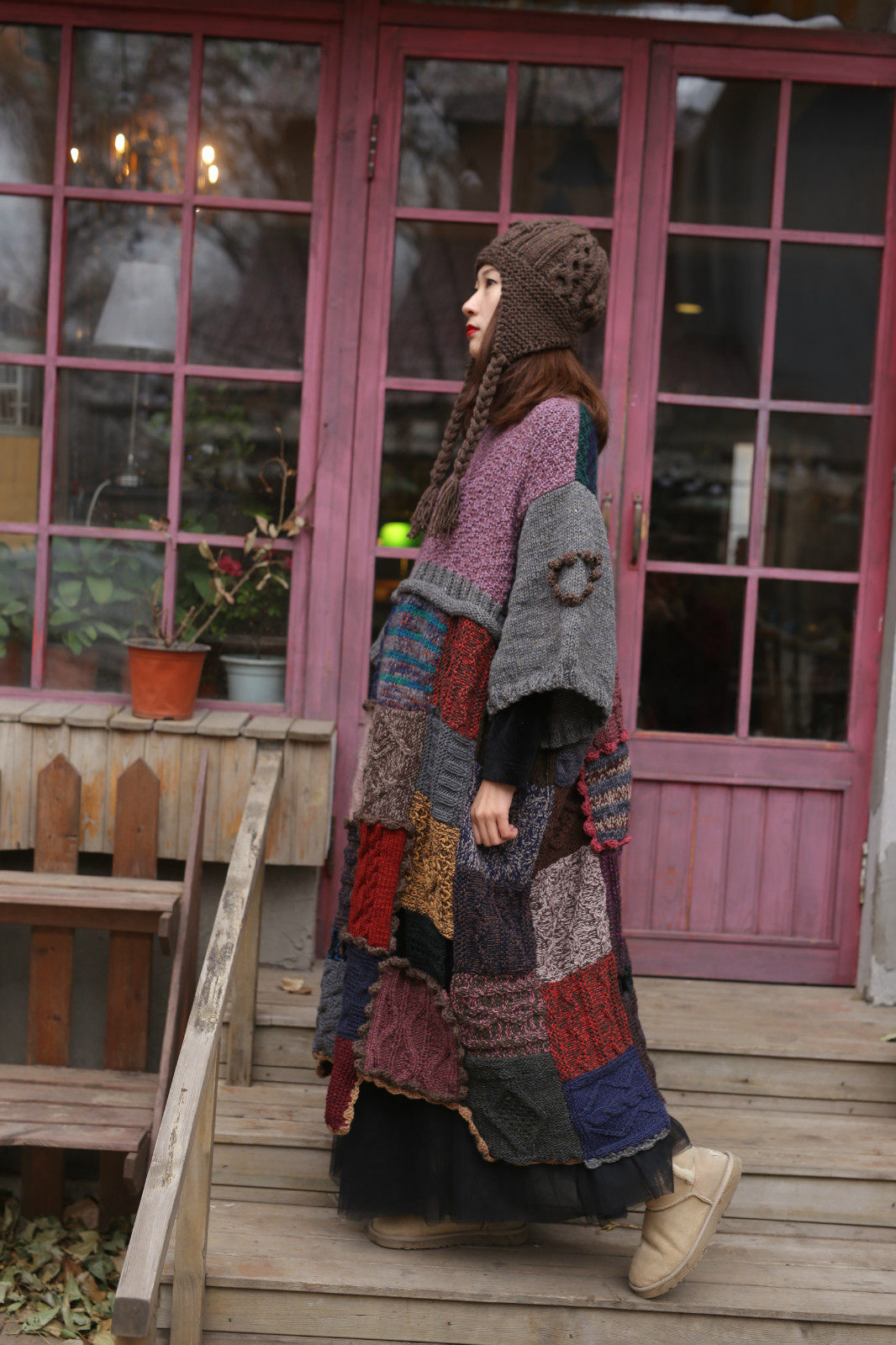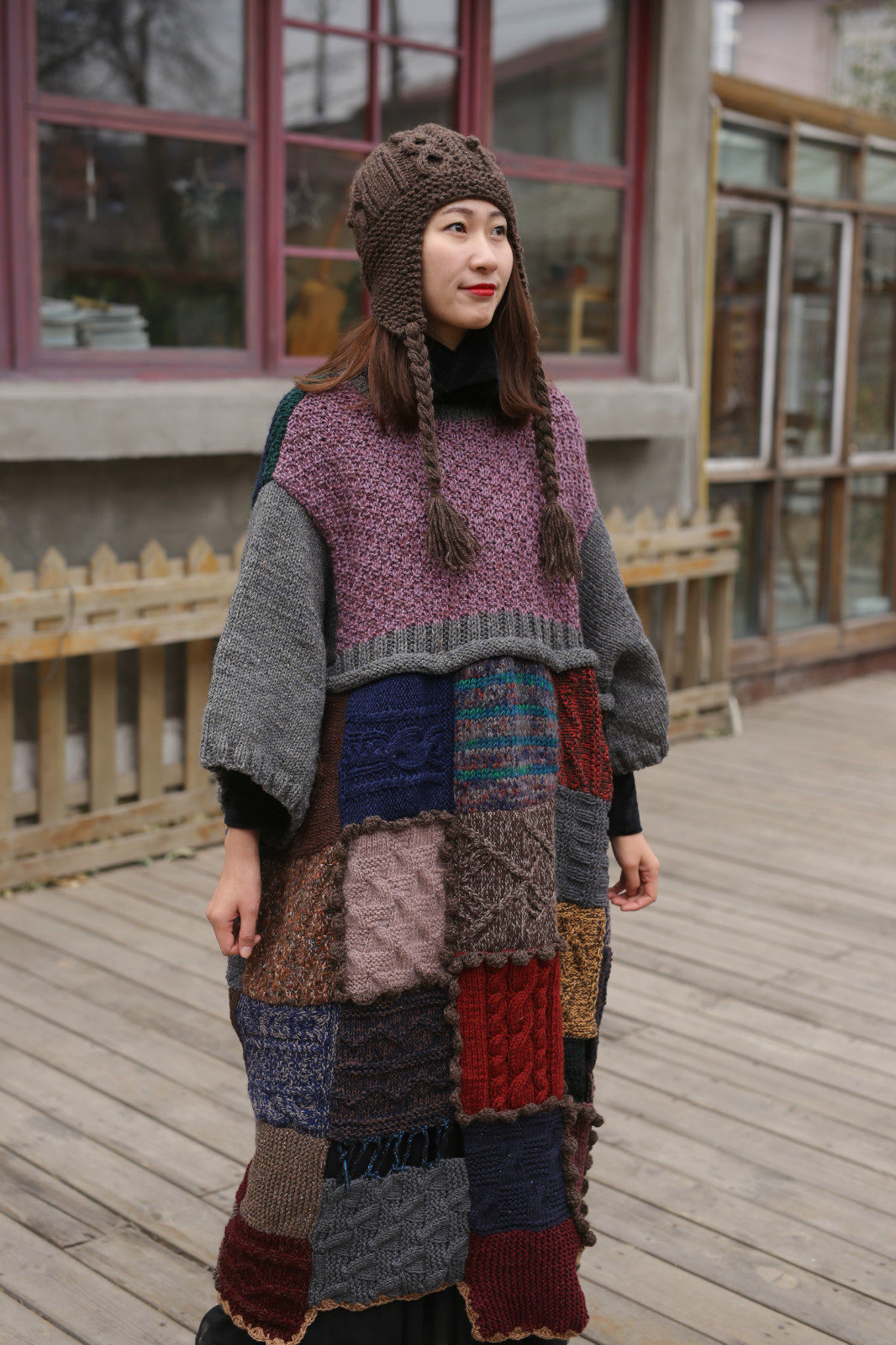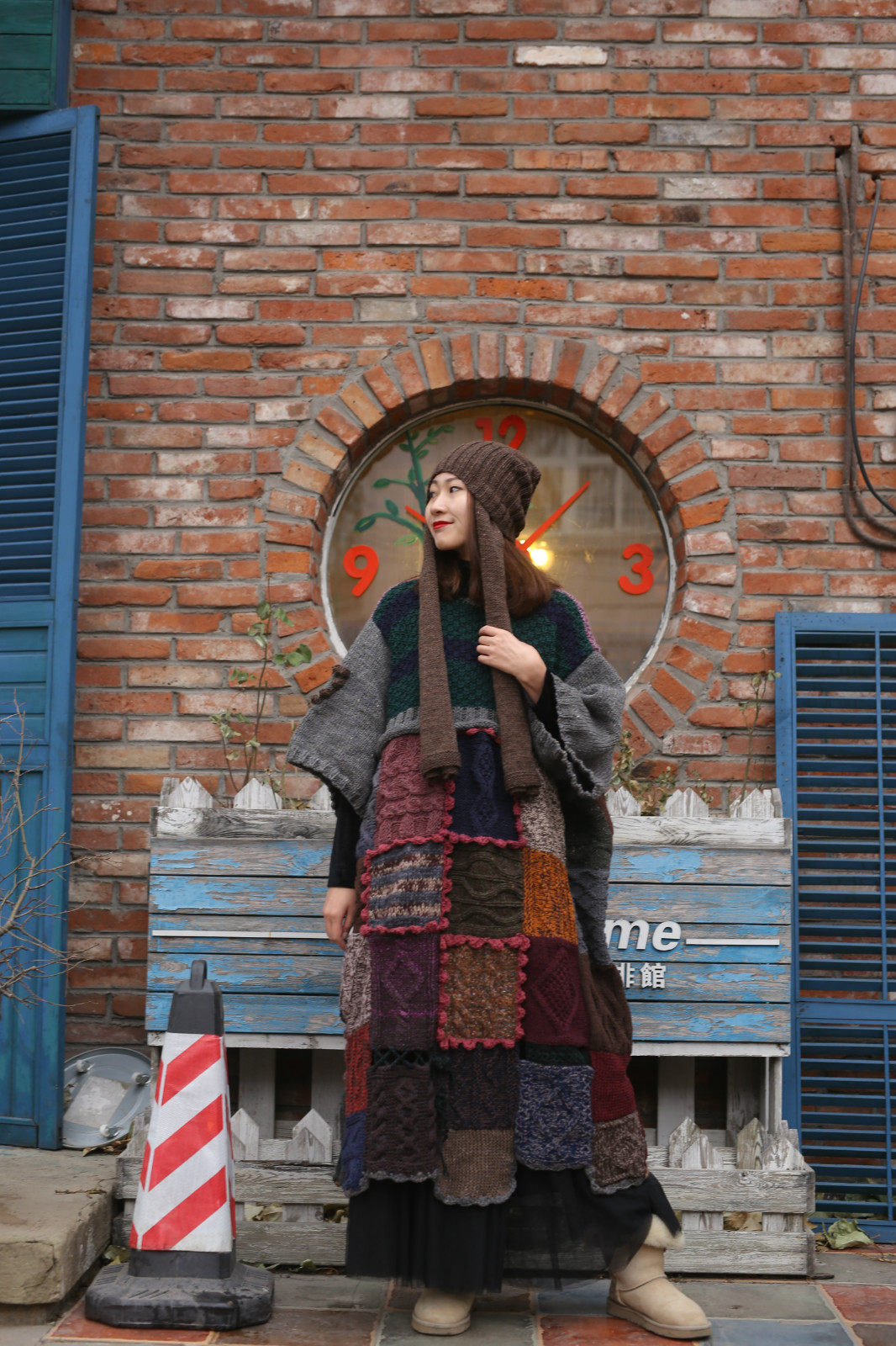 One thousand-year ~ original literature and art Fan retro pure handmade knitted splicing loose foreign dress wool bifacial dress