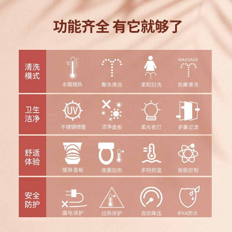 Butt wash Female wash Seat ring Heating water temperature adjustment Water pressure adjustment Warm air drying nozzle Self-cleaning nozzle Mobile cleaning