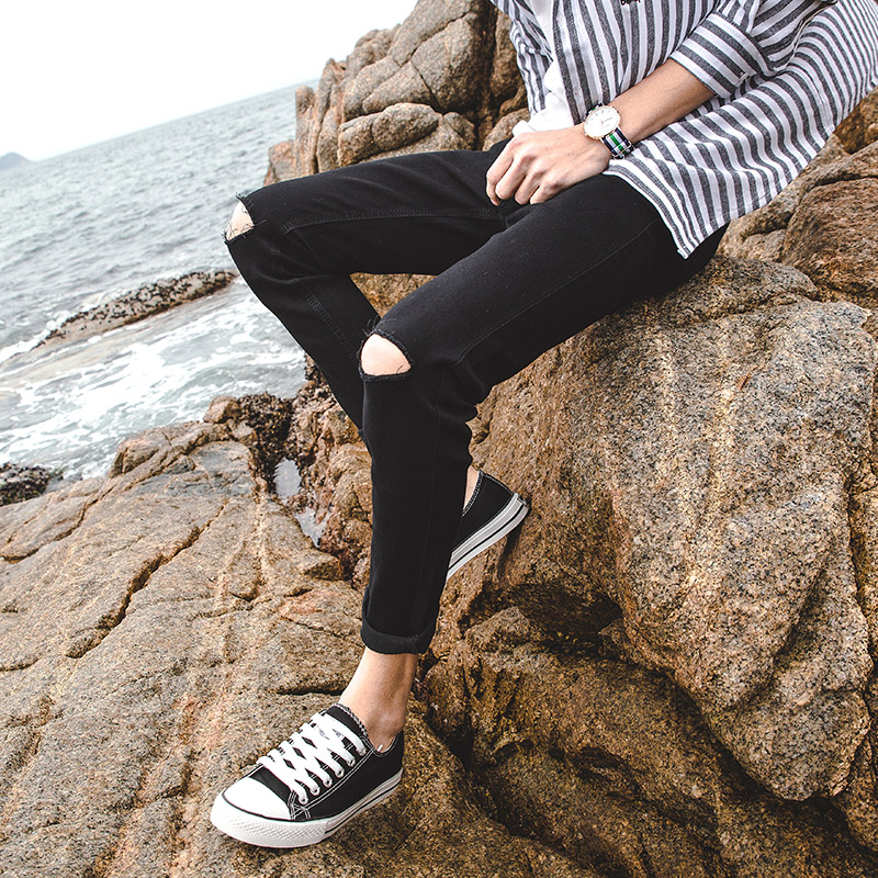 Black knee one word hole 9 points boys jeans ninth pants trend Korean version of the slim men's beggar pants