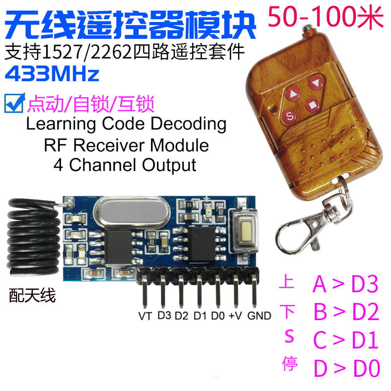 5V wireless remote control switch receiver transmitter 4-way decoding module output high level 1527 learning 433Mh