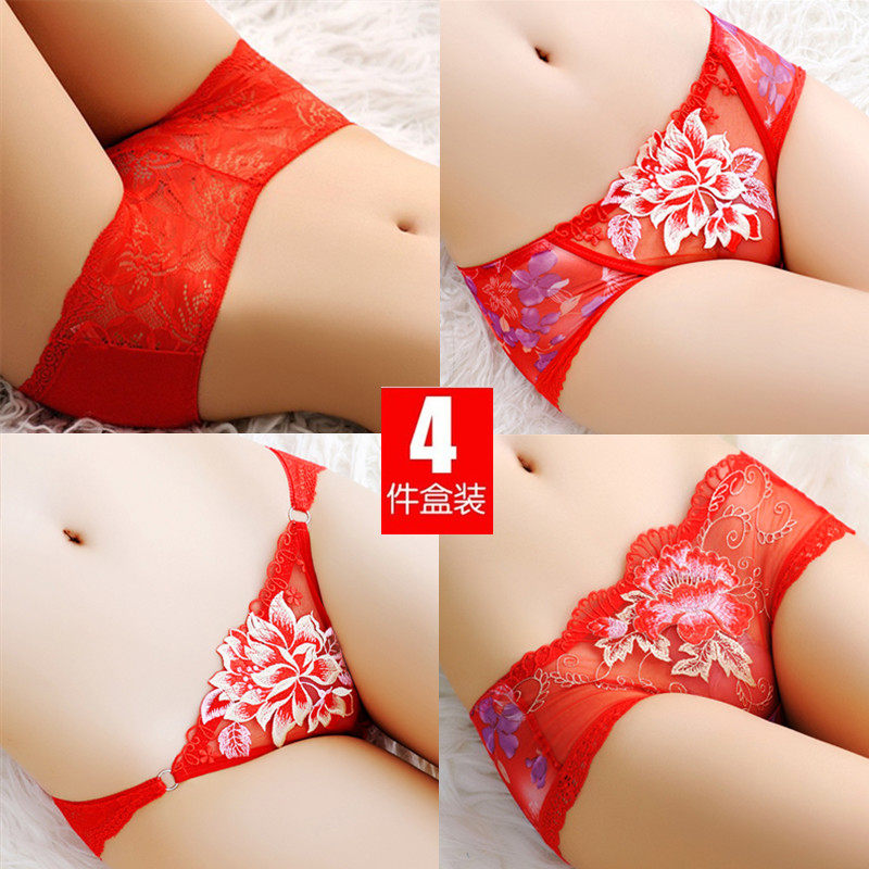 4 Packs Sexy Embroidered Lace Panties Transparent Seduction Flower Pure Cotton Crotch Briefs for Ms.