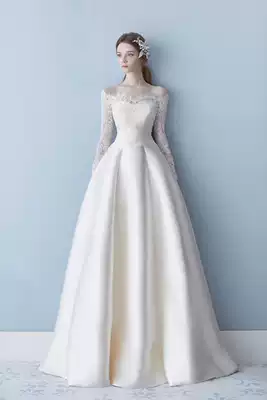 2021 new one-shoulder long-sleeved lace satin thin bride small man Qi wedding dress simple retro wedding dress