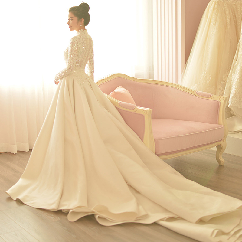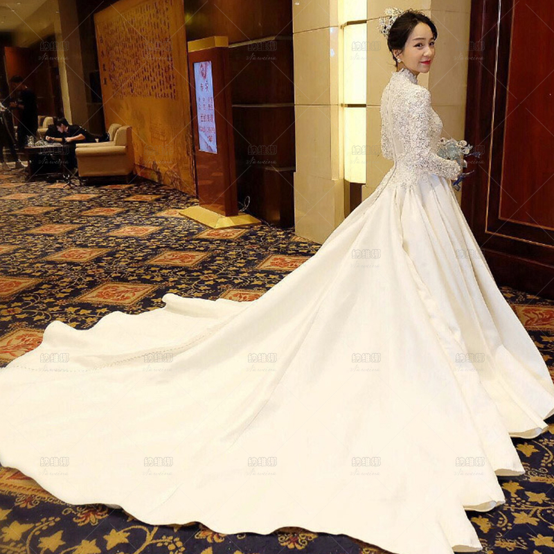 Vintage French light main wedding dress 2021 new bride long-sleeved simple satin tail small Hepburn woman