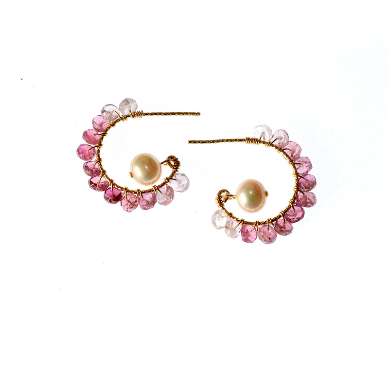 Three-in-one grass October birthstone CINCTURE gradient color tourmaline pearl surround import 14k package gold earrings