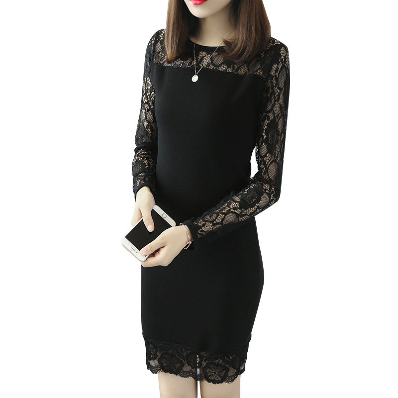 2018 spring and autumn Korean version of fashion temperament long-sleeved lace knitted dress women's medium and long version slim hip bottom skirt