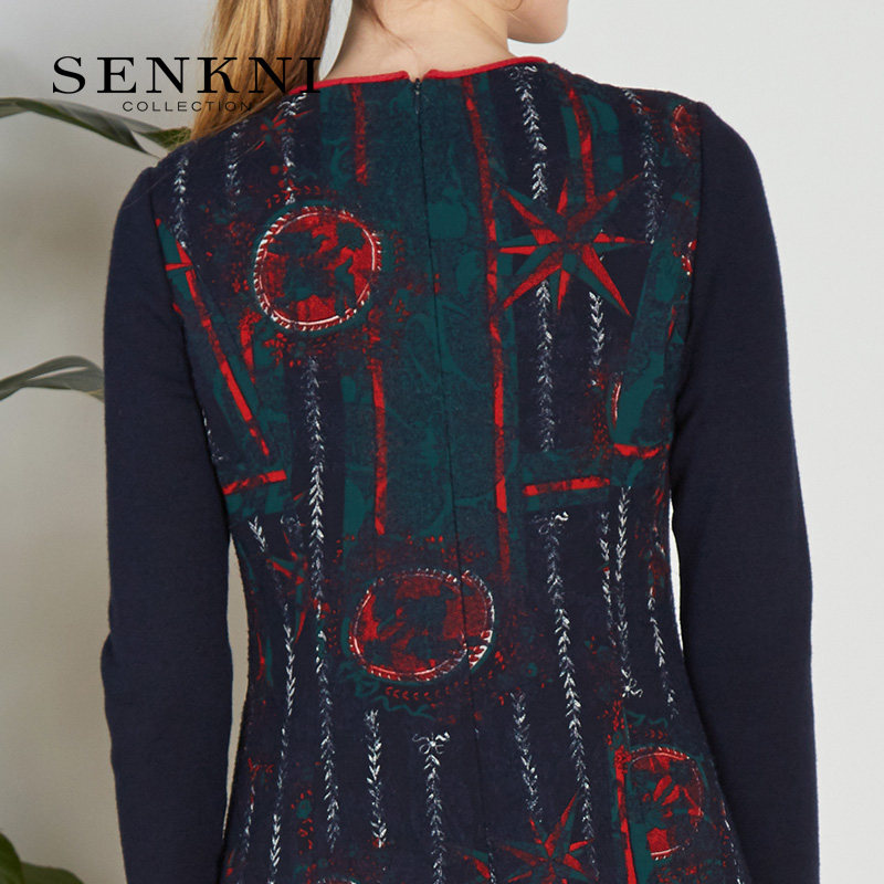 Santa Cani Mall With New Pint Round Collars Color Splicing Temperament Winter Long Sleeve Foreign Dress Embroidered midway skirts