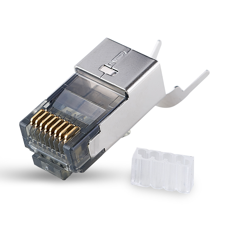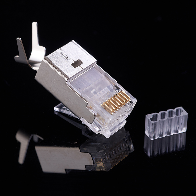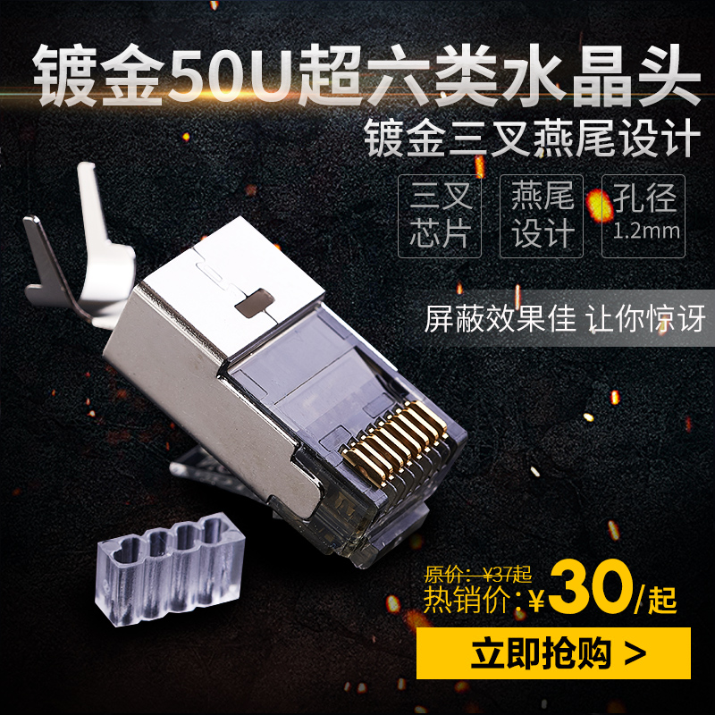 Copper shell gold plated 50u super six type network crystal head 3 fork with tail clip RJ45 shielded mesh head aperture of 1.2MM