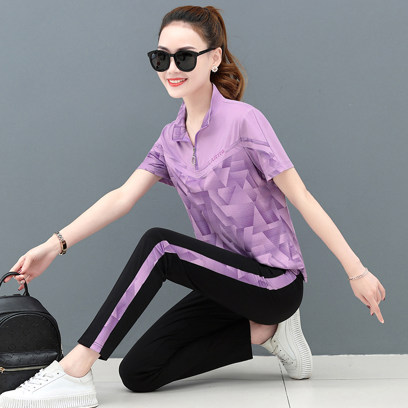 Brand sports suit women's summer 2021 new fashion thin short-sleeved stand-up collar trousers casual clothes two-piece set tide