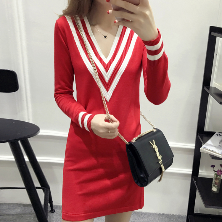 2022 autumn new women's mid-length V-neck sweater striped navy style loose bottoming sweater women's dress