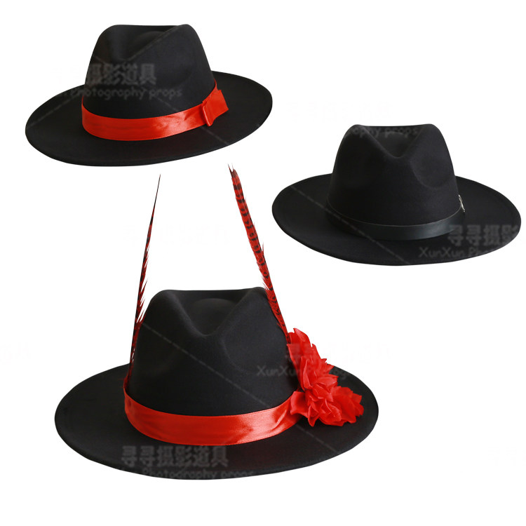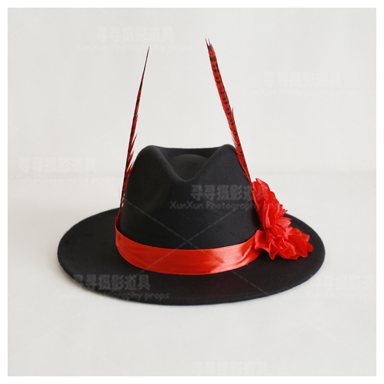 Black Red Side Hat Big Red Flowers Feather hat Red side hat big along flat top red dragon pattern hat large along flat top black big red flower hat red embroidered ball (suit) gold frame grey sheet black frame grey