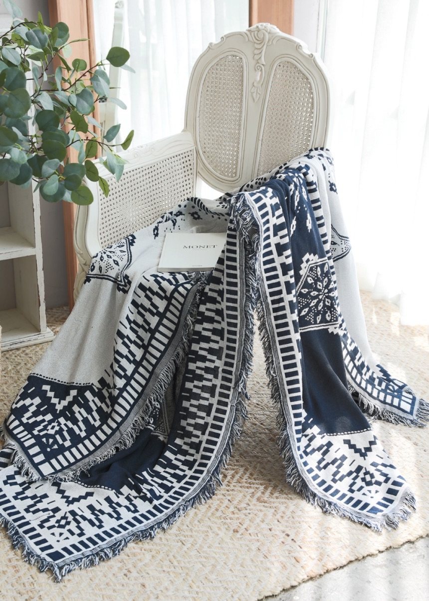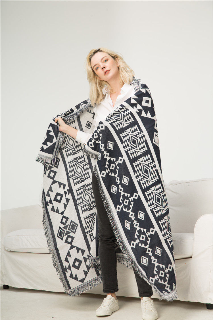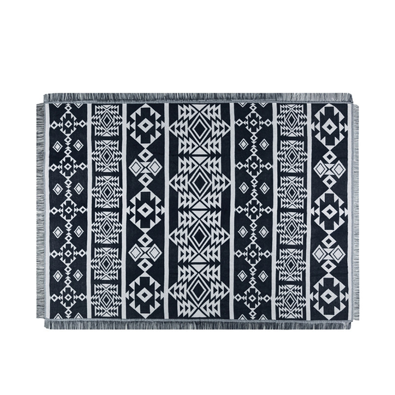 Outdoor Picnic Blanket Black Partial Blue Retro Black & White Geometric Indie National Wind Sofa Blanket Decoration Blanket