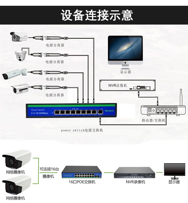 16 standard POE switch 48V power supply monitoring equipment network camera with light gate gigabit switch