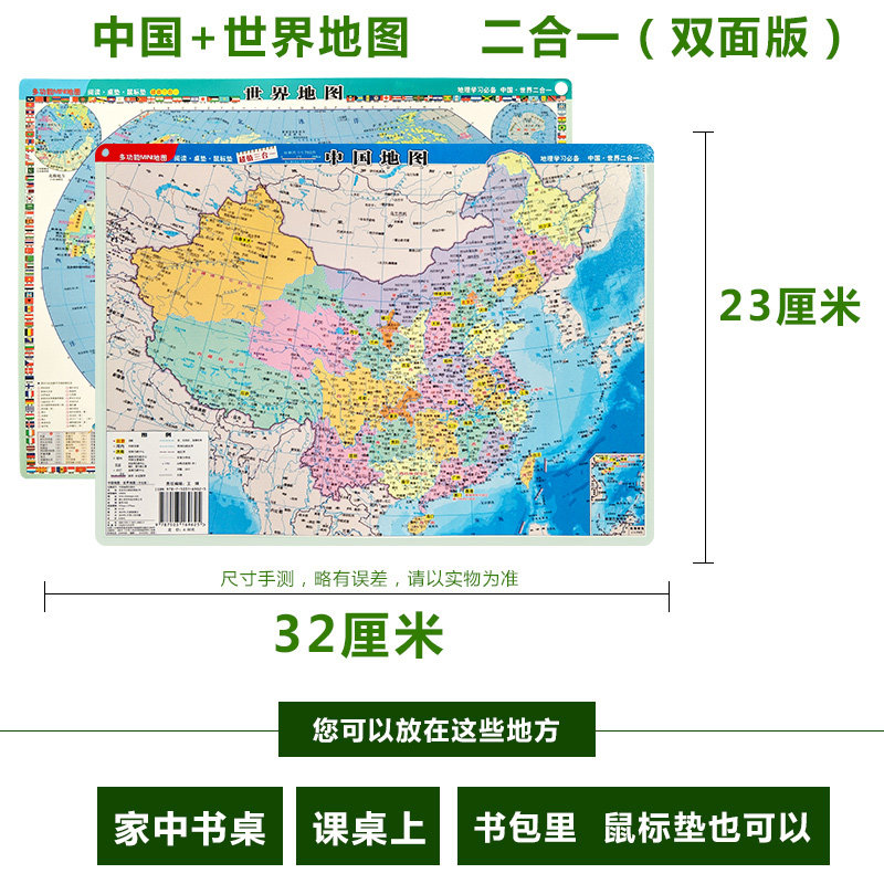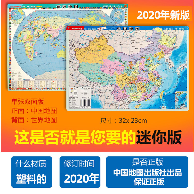 Mini version 2020 new genuine China map World map Multi-function mini map for primary and secondary school students geography learning two-in-one small mouse pad size household plastic texture map portable