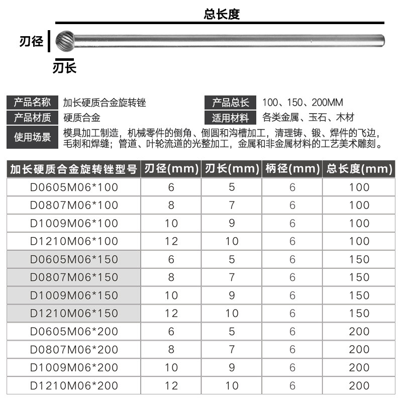 Golden Eagle D-type extended handle carbide rotary file tungsten steel milling cutter grinding head woodworking metal carving tool 6mm