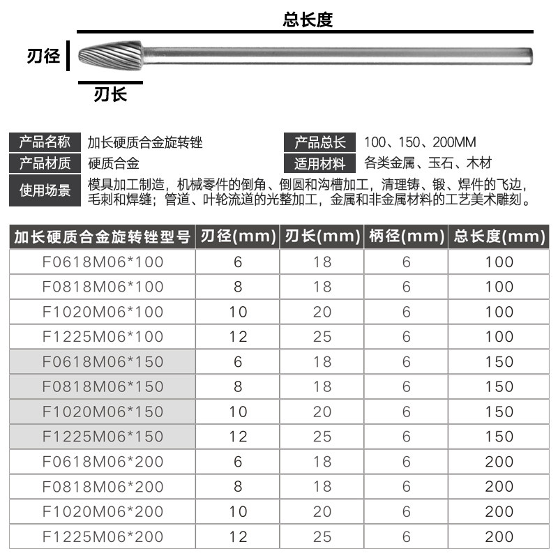 Golden Eagle F Type Lengthened Shank Cemented Carbide Rotary Filing Tungsten Steel Milling Cutter Grinding Head Woodworking Metal Engraving Tool 6mm