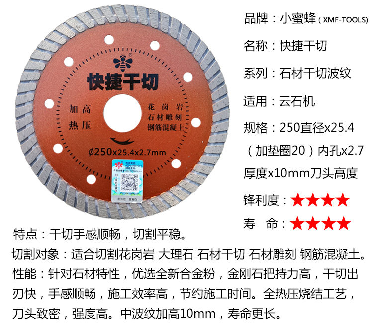 Small bee quick dry-cut granite stone cutting sheet reinforced concrete cutting sheet stone carving sheet 250