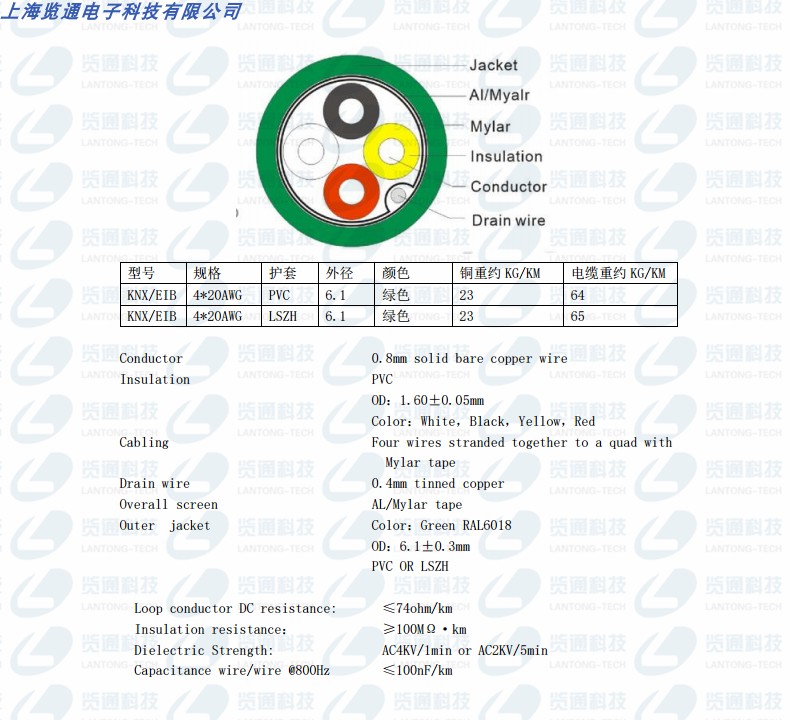 KNX EIB European installation bus cable 2X2X0 8(4X20AWG) single copper wire green pvc sheath