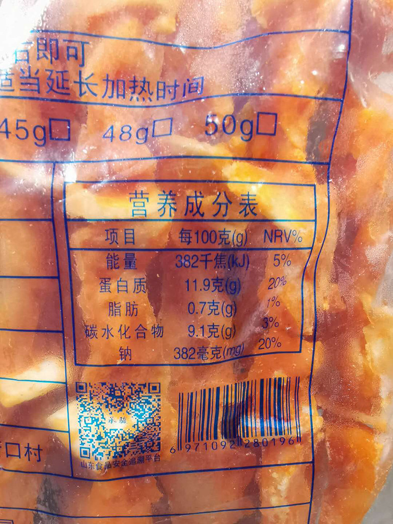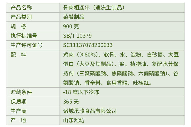 Chicken (≥70%)Cartilage Water Starch White sugar salt Vegetable oil Sodium tripolyphosphate Sodium glutamate Chili red