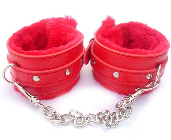Pink plush handcuffs a pair of red plush handcuffs a pair of black plush handcuffs a pair