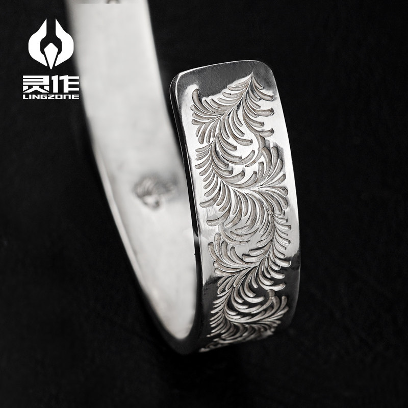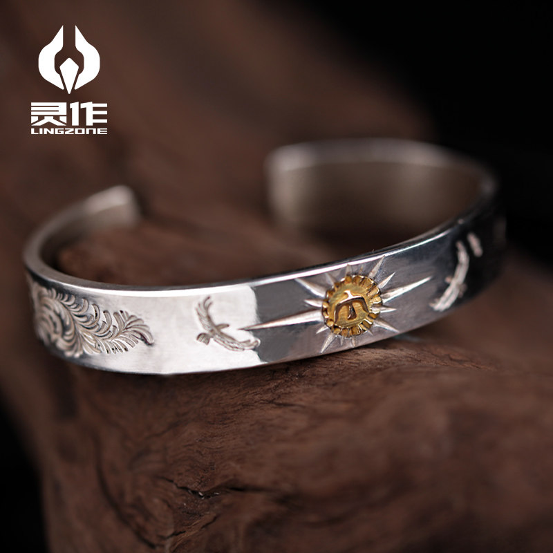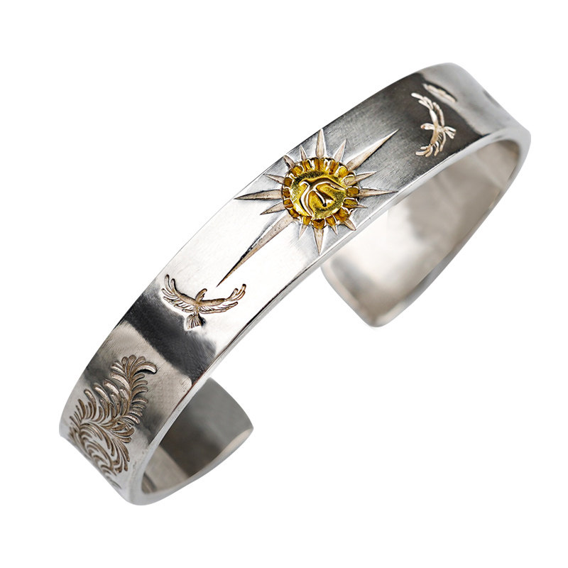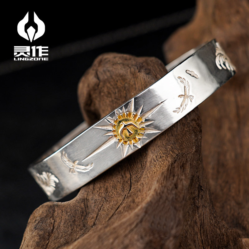 Ling Zuo silver ornaments point gold thunderbird sun Tang grass pattern sterling silver bracelet AU750 pure hand chiseled bear father produced