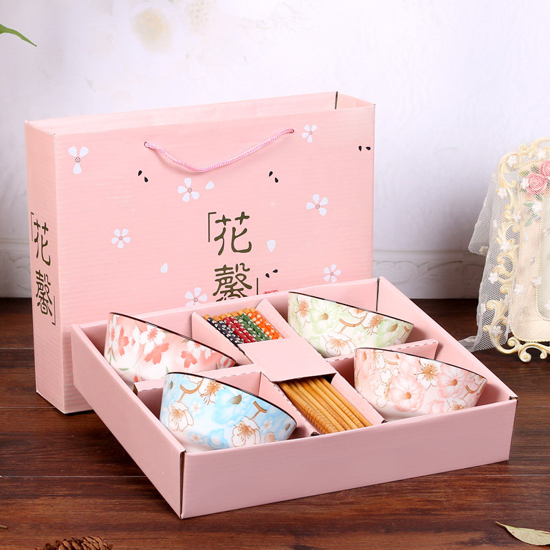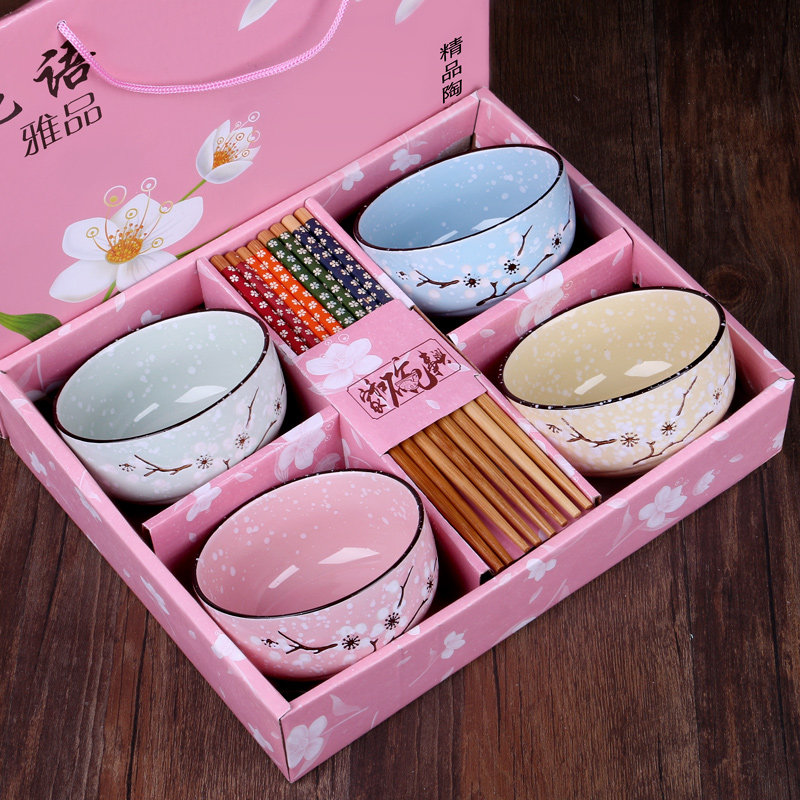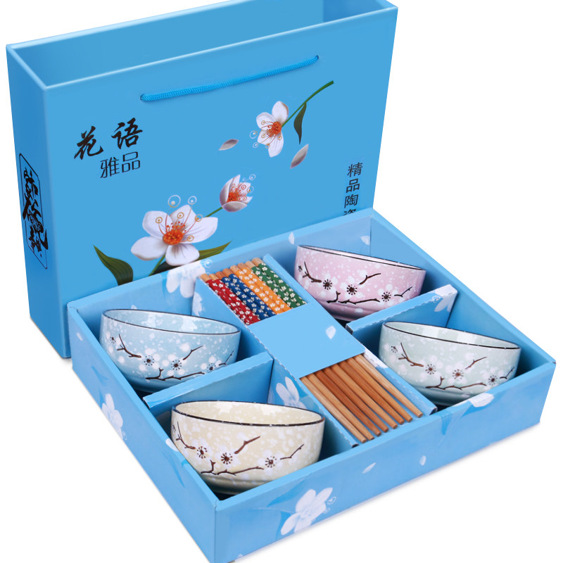 Blue box, four colored plum blossoms, four bowls, four chopsticks, pink (two bowls, two chopsticks, two plates), green (two bowls, two chopsticks, two plates), blue (two bowls, two chopsticks, two plates), pink box, plum blossom, four bowls, four chopsticks, Huaxin pink (four bowls) Four chopsticks) yellow