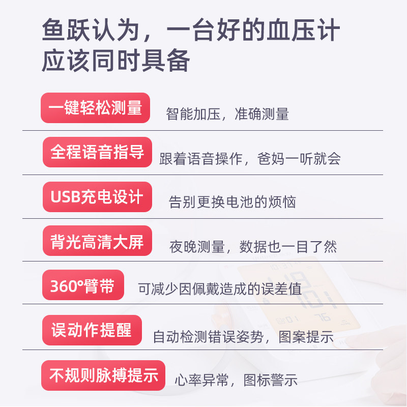 Body motion prompt Automatic Semi-automatic font large screen large backlight display Voice broadcast with AC power supply Rechargeable 360°multi-angle measurement arm with double switching one-button measurement